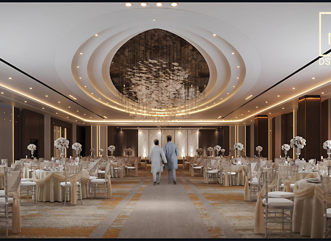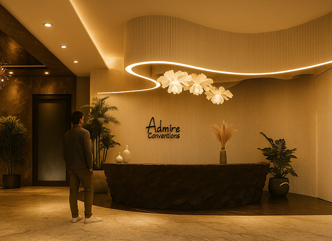 Our design for the new Convention Centre, "Admire Conventions," is a testament to redefining celebration spaces through an exquisite blend of elegance, style, and unparalleled functionality. From the moment guests step inside, they are enveloped in an atmosphere of sophisticated grandeur, where every detail is meticulously crafted to elevate the event experience. The expansive ballrooms, featuring breathtaking, sculptural chandeliers and a harmonious palette of luxurious materials, are designed to host unforgettable celebrations, creating a truly opulent yet contemporary backdrop for any occasion.